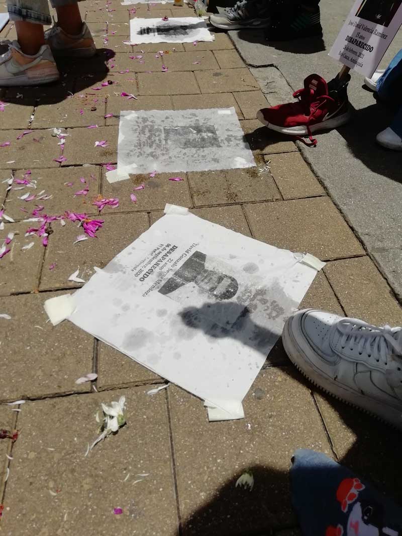 "Las ausencias, los cuerpos sin cuerpo, y la imposibilidad de realizar un ritual digno y de resignación con quienes ya no están, hacen que la Desaparición Forzada transcienda la mera nominación del hecho victimizante. La reparación simbólica, la reconciliación con el victimario (luego de conocer la verdad) y con sí mismo, han sido medios por los cuales diversos grupos se han unido para hacerle frente al dolor y encarar los vacíos que genera la desaparición. El pasado 9 de abril, las mujeres buscadoras realizaron una actividad con fotografías (impresas) de familiares desaparecidos ubicadas en forma de círculo y con goteros cubrieron el rostro de sus seres queridos. El acto de cubrir con agua los rostros simbolizó dos aspectos: Las lágrimas derramadas de aquellos y aquellas que buscan a sus seres queridos, y lo que han significado los ríos en los procesos de búsqueda. Por más agua que la imagen comenzaba a tener, esta nunca desapareció en su totalidad; un sentido que expresa, finalmente, el tiempo de búsqueda de las víctimas indirectas: Buscar hasta encontrarles."